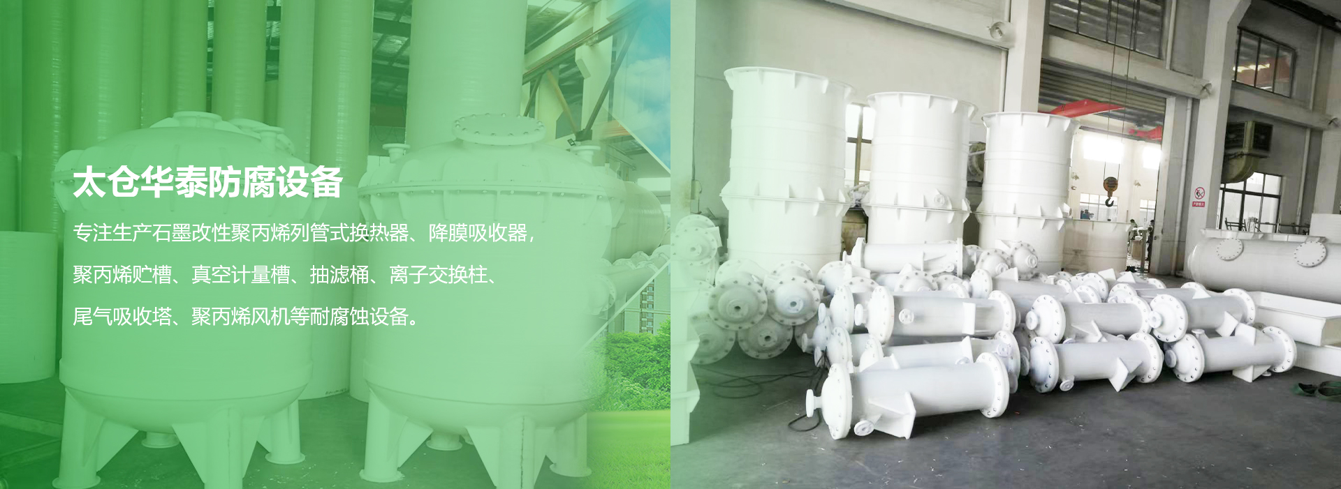 太倉華泰防腐設備有限公司是專業生產石墨改性聚丙烯列管式換熱器、降膜吸收器,聚丙烯貯槽、真空計量槽、抽濾桶、離子交換柱、尾氣吸收塔、聚丙烯風機等耐腐蝕設備。